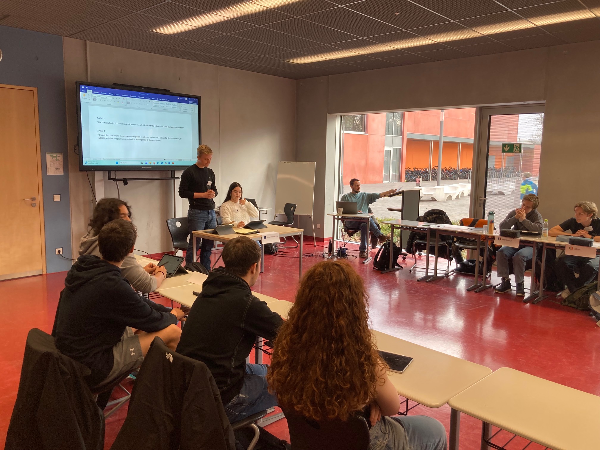 Das Thema der Sitzung war ein Gesetzesvorschlag der EU-Kommission, der die Klimaneutralität und die finanzielle Unterstützung der Mitgliedstaaten zum Ziel hatte. Die Schülerinnen und Schüler diskutierten intensiv über den Vorschlag, bestehend aus zwei zentralen Artikeln. Dabei mussten sie nicht nur ihre eigenen nationalen Interessen vertreten, sondern auch nach Kompromissen suchen, um zu einer gemeinsamen Lösung zu kommen. Dies gelang in der Diskussion in Kleingruppen auf der Suche nach gleichgesinnten Koalitionspartnern sowie in der Auseinandersetzung mit Delegierten von Ländern mit konträren Positionen.